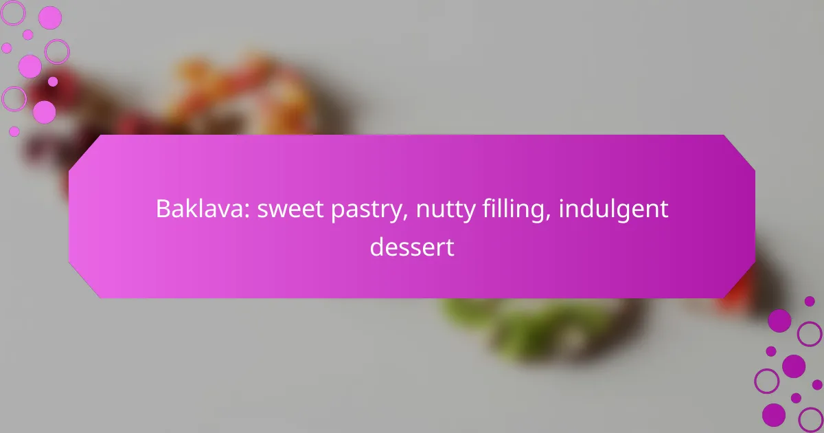 Baklava is a rich dessert made primarily from layers of phyllo pastry, nuts, and honey or syrup. Its nutritional profile varies based on ingredients, but it is generally high in calories, sugars, and fats, making it an indulgent treat.